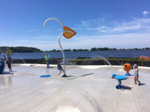 View Lake Michigan from the top of the sandy hill at Summit Park while the kids play on the pirate-ship themed playground.