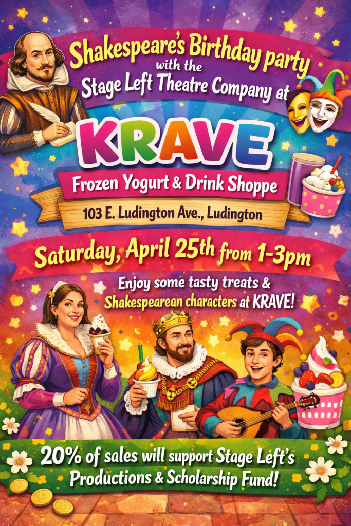 What better way to celebrate than with a little drama, fun, and something sweet? Join Stage Left to celebrate Shakespeare’s special day at KRAVE Frozen Yogurt & Drink Shoppe- 103 E. Ludington Ave., Ludington on Saturday, April 25th from 1–3pm!